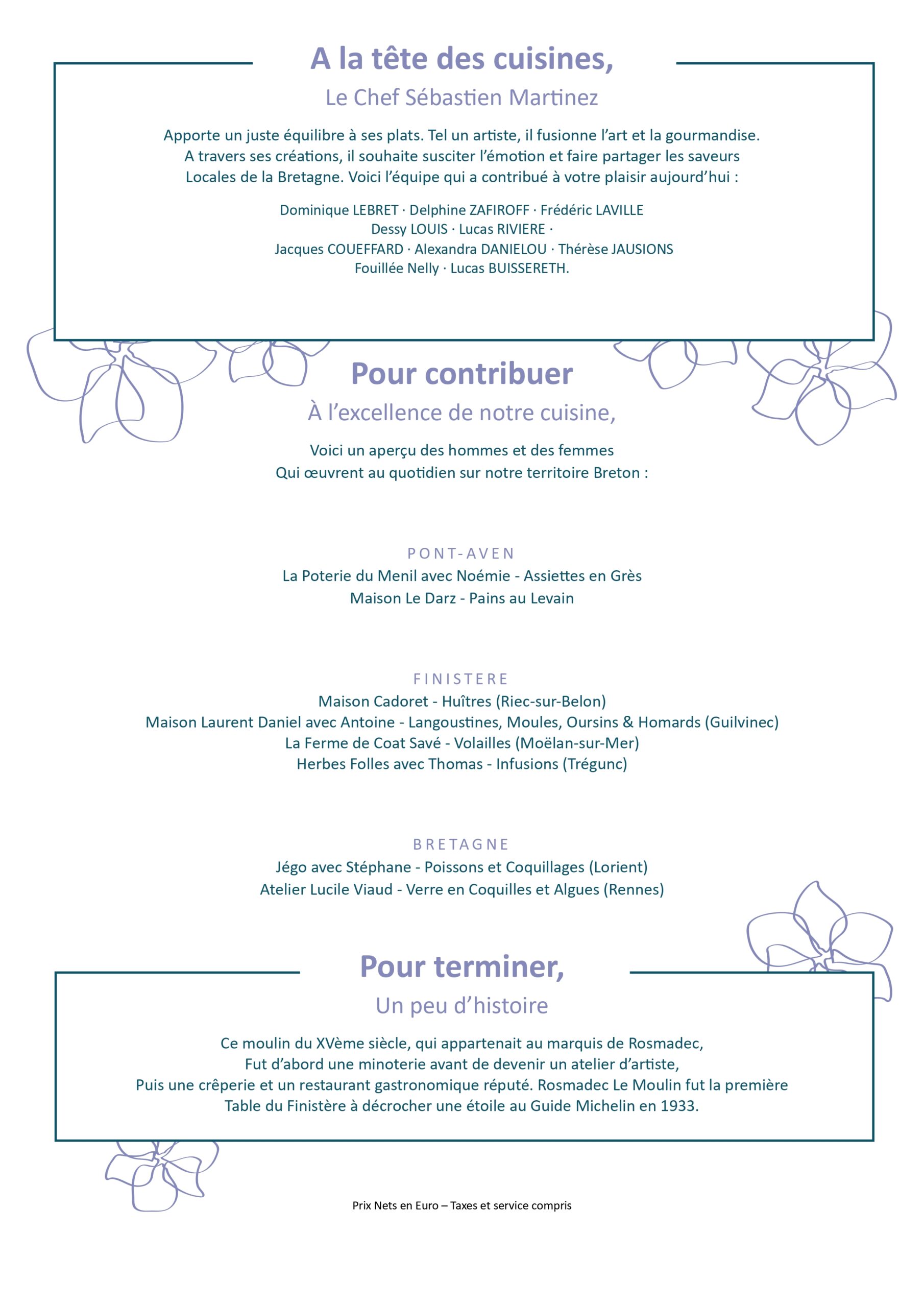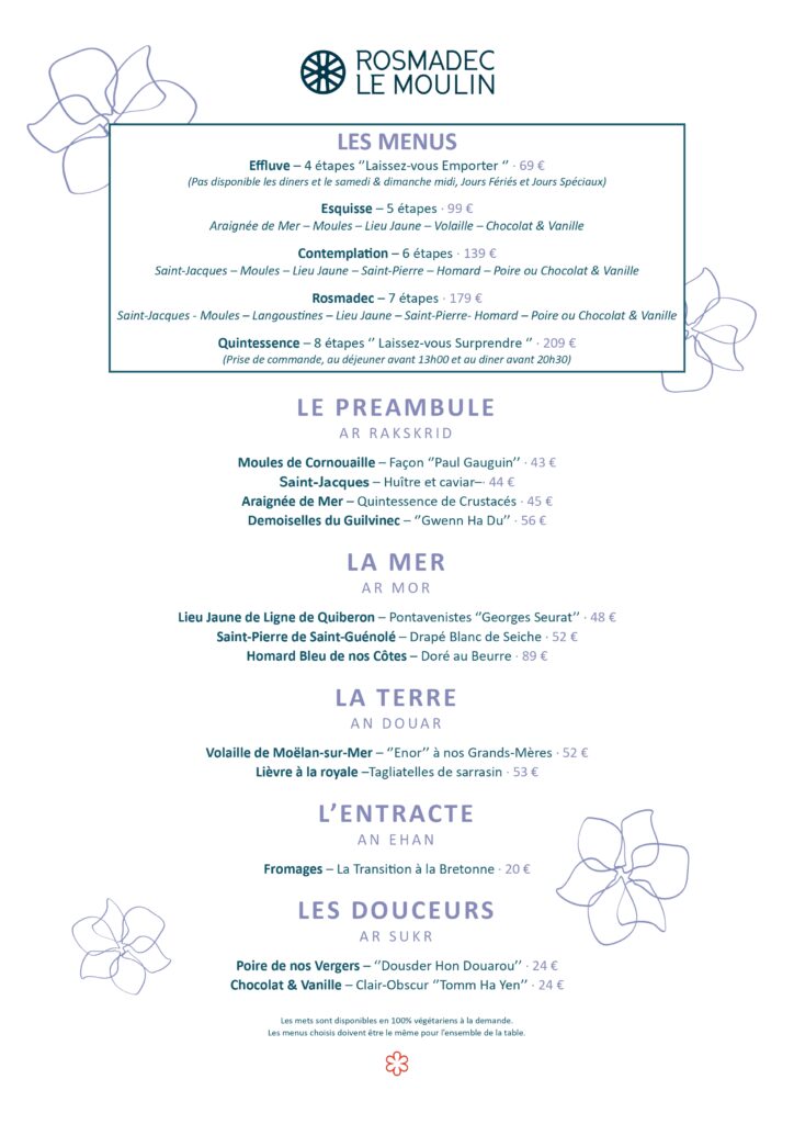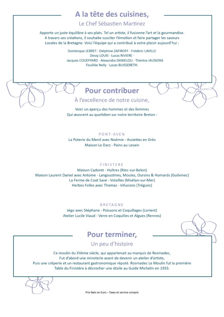 Tous les produits cuisinés par le chef Sébastien Martinez et sa brigade sont des produits frais, de saison, rigoureusement sélectionnés auprès de fournisseurs de proximité pour faire la part belle aux circuits-courts et à la Bretagne évidemment ! Les menus changent avec les saisons.
